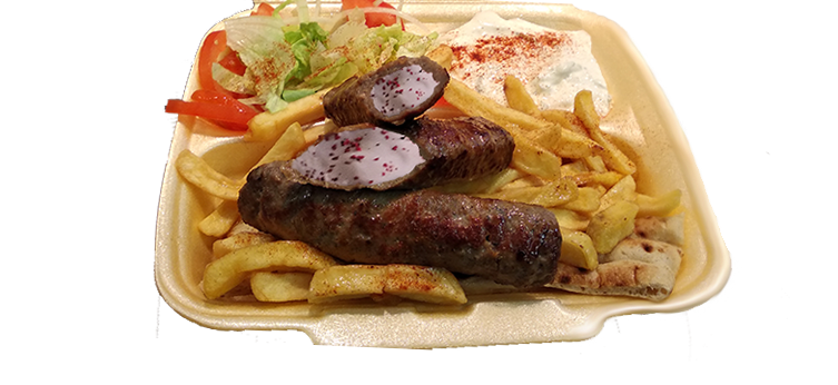 2 pcs of Greek style sausage with tomato, fries, onion, lettuce and the world famous Greek sauce tzatziki