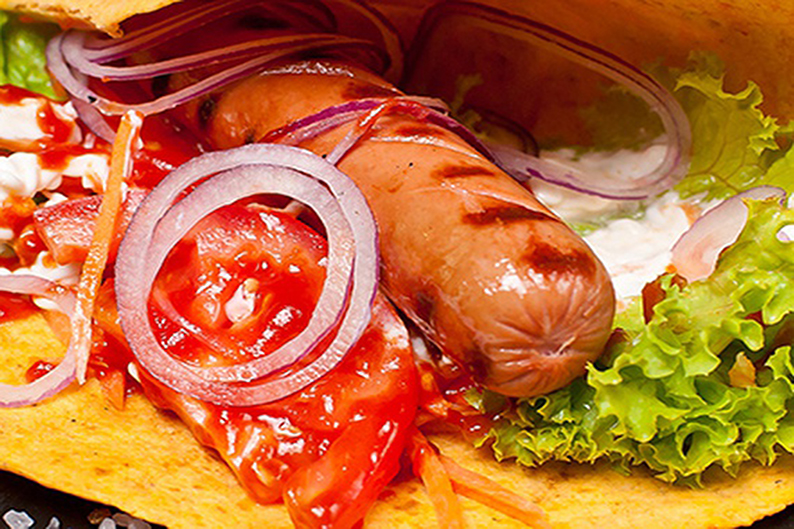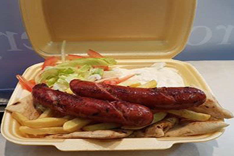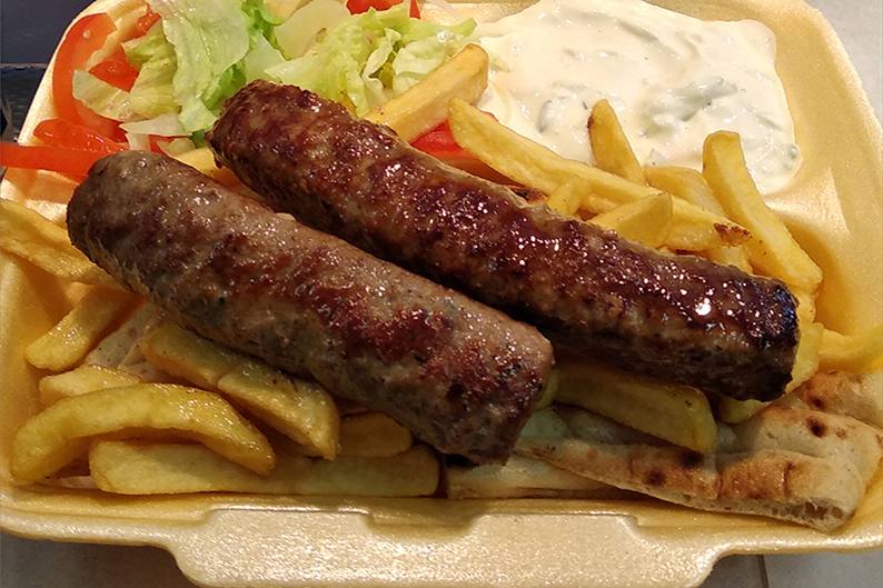 2 pcs of Greek style sausage with tomato, fries, onion, lettuce and the world famous Greek sauce tzatziki