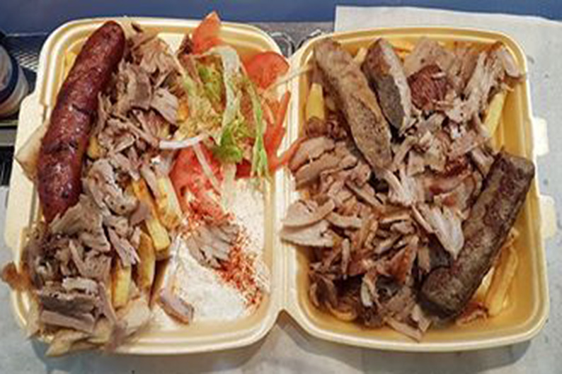 Full of Gyros pork, chicken, 1kebab, 1stuffed kebab, 1sausage, large fries, salad, 1dip.